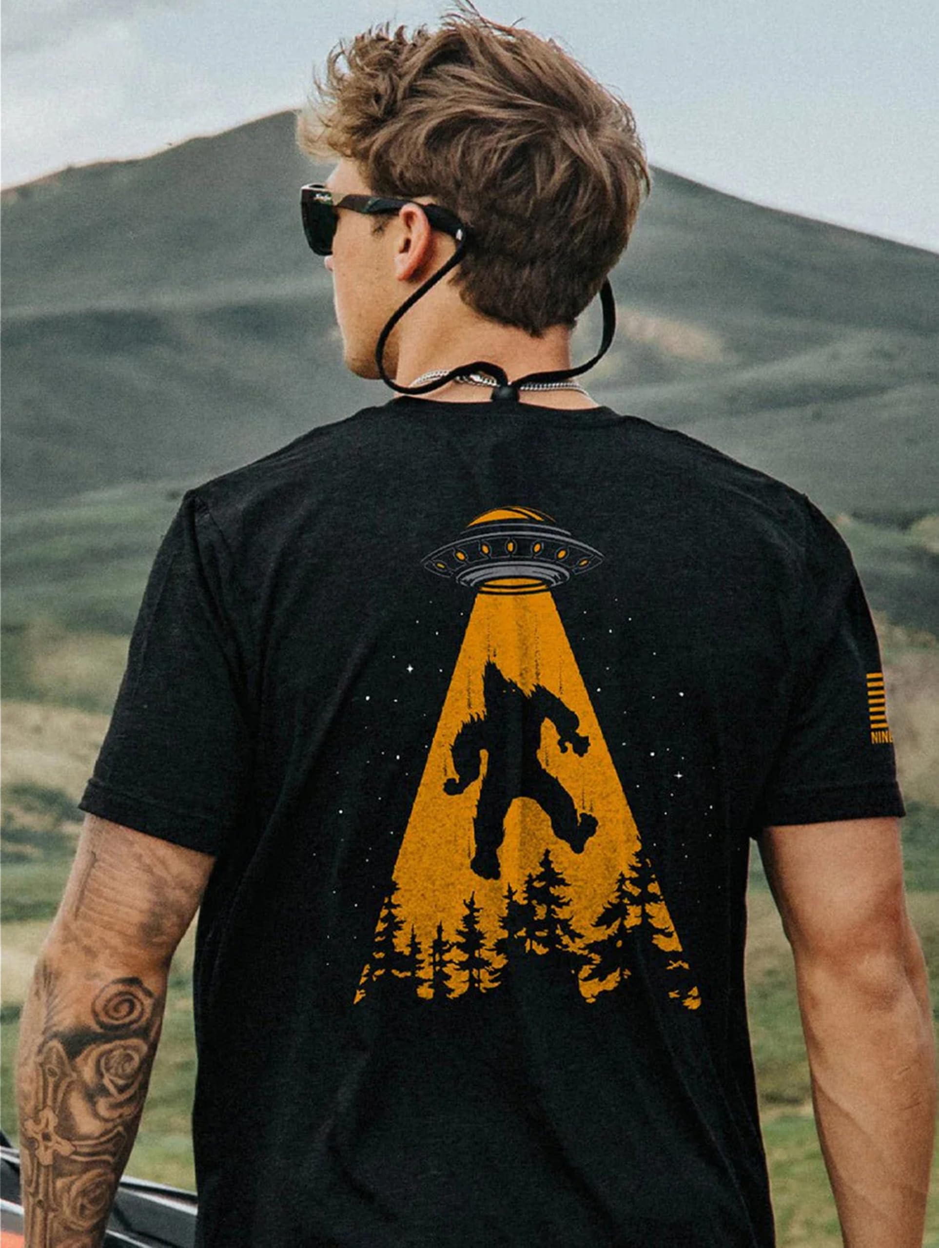 - Beam Me Up, Squatchy: The back graphic features a bold, playful scene of Bigfoot mid-abduction, caught in a wide orange beam from a hovering UFO. The beam stretches down into a dense forest of black pine silhouettes, with stars scattered across the night sky as Sasquatch floats upward in a classic outstretched pose